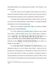 Meteorológica Mundial, "pero en numerosas partes del mundo - más de 20 países - existe escasez de agua". El año 2025, el 80 por ciento de la población urbana mundial vivirá en países en desarrollo. Estos últimos necesitarán la ayuda de los países más ricos para poder ofrecer un 53 suministro adecuado de agua dulce e inocua a sus poblaciones en pujante crecimiento. En el pasado, muchas ciudades estaban situadas en lugares cercanos a los ríos. Hoy en día, cada vez más ciudades importantes, Ciudad de México o Los Ángeles por ejemplo, están alejadas de su fuente de abastecimiento de agua. Muchos de esos problemas se podrían haber evitado si los urbanistas se hubieran planteado ciertas cuestiones fundamentales. El Sr. Obasi considera que los problemas urbanos en materia de agua se pueden aliviar siempre y cuando las ciudades conozcan bien su entorno natural y obtengan los medios para pronosticar las condiciones meteorológicas futuras. "Con frecuencia, los urbanistas se olvidan de que es necesario establecer sistemas eficaces de recopilación y tratamiento de datos hidrológicos, así como servicios de predicción de crecidas y de 54 desagüé", dice el Sr. Obasi. No podemos dejar de lado la importancia de las aguas subterráneas ya que substanciales acuíferos en el oeste de Estados Unidos, México y América del Sur son amenazados por la sobreexplotación y la contaminación. En América del Sur, del 40 al 60 por ciento del agua proviene de acuíferos que enfrentan la contaminación siempre en aumento producida por el incremento de la actividad minera y agrícola. En México, 102 de los 653 acuíferos son sobreexplotados, siendo la fuente principal de abastecimiento de agua 53 http://www.wmo.ch/web/Press/watersp.html, Organización Meteorológica Mundial 54 Ibíd.
