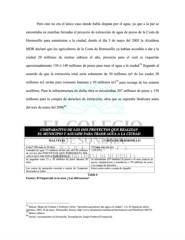 Pero este no era el único caso donde había disputa por el agua, ya que a la par se encontraba en marchas forzadas el proyecto de extracción de agua de pozos de la Costa de Hermosillo para suministrar a la ciudad, donde el día 5 de mayo del 2005 la Alcaldesa MDR declaró que los agricultores de la Costa de Hermosillo ya habían accedido a dar a la ciudad 20 millones de metros cúbicos al año, proyecto para el cual se requerían 78 aproximadamente 130 ó 140 millones de pesos para traer el agua a la ciudad llegando al acuerdo de que la extracción total sería solamente de 30 millones m3 de los cuales 20 79 millones m3 serían para consumo humano y 10 millones m3 para recarga de los mantos acuíferos. Para la infraestructura de dicha obra se necesitaban 207 millones de pesos y 150 millones para la compra de derechos de extracción, obra que se esperaba finalizara antes 80 del mes de enero del 2006 . COMPARATIVO DE LOS DOS PROYECTOS QUE REALIZAN EL MUNICIPIO Y AGUAHH PARA TRAER AGUA A LA CIUDAD MALVINAS COSTA DE HERMOSILLO Costo* 500 mdp en 20 años. 357 mdp una sola vez. Cantidad de agua 7.5 millones de m3 por año 26 millones 7.8% 25% de m3 por año PORCENTAJE QUE REPRESENTA DEL AGUA QUE NECESITA HERMOSILLO. Se pagarían entre 23 y 26 millones de pesos durante 20 Se destinarían 207 millones de pesos a la obra (batería de años. pozos, equipamiento y acueducto) y 150 millones de pesos a la compra de derechos. Los costos de operación correrán a cuenta de Campestre Estos costos serán a cuenta de Aguahh. Hacienda La Labor. Tabla 6 Fuente: El Imparcial en la nota ¿Las diferencias? 78 Salazar, María del Carmen y Norberto Corral, “Aprueban agricultores dar agua a la ciudad”, 1/A, El Imparcial, diario matutino, 2005, 20 de mayo. Hermosillo, Sonora. http://www.elimparcial.com/buscar/traernotanew.asp?NumNota=440722 79 Metros cúbicos 80 Fuente: Ayuntamiento de Hermosillo. Recopilación: Sergio Fimbres/El imparcial.