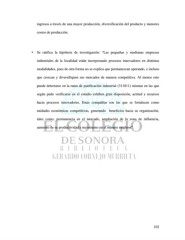 ingresos a través de una mayor producción, diversificación del producto y menores costos de producción. Se ratifica la hipótesis de investigación: “Las pequeñas y medianas empresas industriales de la localidad están incorporando procesos innovadores en distintas modalidades, pues de otra forma no se explica que permanezcan operando, e incluso que crezcan y diversifiquen sus mercados de manera competitiva. Al menos esto puede detectarse en la rama de panificación industrial (311811) mismas en las que según pudo verificarse en el estudio exhiben gran disposición, actitud y recursos hacia procesos innovadores. Estas compañías son las que se fortalecen como unidades económicas competitivas, generando beneficios hacia su organización, tales como: permanencia en el mercado, ampliación de la zona de influencia, aumento de su productividad e incremento en el número empleos”. 102