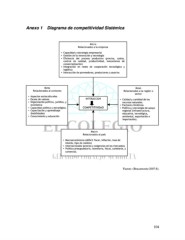 Anexo 1 Diagrama de competitividad Sistémica Micro Relacionados a la empresa • Capacidad y estrategia empresarial • Gestión de la innovación y tecnología • Eficiencia del proceso productivo (precios, costos, control de calidad, productividad, mecanismos de comercialización) • Integración en redes de cooperación tecnológica y logística • Interacción de proveedores, productores y usuarios Meta Meso Relacionados al contexto Relacionados a la región o sector • Aspectos socioculturales • Escala de valores INTERACCIÓN • Calidad y cantidad de los • Organización política, jurídica, y recursos naturales. económica • Factores climáticos. • Capacidad política y estratégica. COMPETITIVIDAD • Política y estrategia de apoyo • Capacitación y aprendizaje regional (infraestructura, (habilidades) educativa, tecnológica, • Conocimiento y educación ambiental, exportación e importación). Macro Relacionados al país • Macroeconómicos (déficit fiscal, inflación, tasa de interés, tipo de cambio) • Internacionales (precios y exigencias de los mercados). • Política presupuestaria, monetaria, fiscal, cambiaria, y comercial. Fuente: (Bracamonte:2007:8). 104