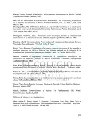 Corona Treviño, Leonel (Coordinador). Cien empresas innovadoras en México. Miguel Ángel Porrua Editores, México, 1997 Del Valle Ma. Del Carmen, Castañon Rosario, Solleiro José Luís. Estructura y perspectivas de la industria de alimentos en México. Comercio Exterior, Vol. 53, Num. 2, Feb. 2003 México, 2003 Domínguez Ríos, Ma. Del Carmen. Enfoque de competitividad sistémica en el estudio de la innovación empresarial. Benemérita Universidad Autónoma de Puebla. Consultado en el 2006, base de datos PROQUEST Domínguez Villalobos, Lilia. Transición hacia tecnologías flexibles y competitividad internacional en la industria mexicana. Editorial Miguel Ángel Pórrua. México, 1998 Dunning, John H. Internationalizing Porter’s diamond. Management International Review, Wiesbaden: Second Quarter 1993, Vol. 33, Iss 2; 9 pgs Dussel Peters, Enrique (Coordinador). Claroscuros; Integración exitosa de las pequeñas y medianas empresas en México. Editorial Jus, Cámara nacional de la industria de la transformación, Comisión económica para América Latina y el Caribe. México 2001 Dutrénit, Gabriela (Compiladora) Acumulación de capacidades tecnológicas en subsidiarias de empresas globales en México. Universidad Autónoma Metropolitana Xochimilco México, 2006 Esser, Klaus (Editor) Competencia global y libertad de acción nacional. Nuevo desafío para la empresas y el Estado y la Sociedad. Editorial Nueva Sociedad. Venezuela, 1999 Garcia de León C., Salvador. Micro, pequeña y mediana industria en México y los retos de la competitividad. Ed. Diana. México, 1993 Garcia, Karla. La cocina familiar en el estado de Sonora, mosaico gastronomico de líneas claras. CONACULTA. México, 2002 Garcia-Pelayo Gross, Ramón. Laruousse Diccionario Ilustrado (10ma. Edición). Ediciones Larousse. México, 1997 Garelli, Stéphane. Competitiveness of Nations: The Fundamentals. IMD World. Competitiveness Yearbook, 2003 Gobierno de México. www.inegi.gob.mx Grein Adreas F.; Craig Samuel C. Economic Performance Over Time: Does Porter´s Diamond Hold at the National Level. The International Executive (1989-1998) May/June 1996 38, 3; ABI/INFORM Global . PROQUEST 152