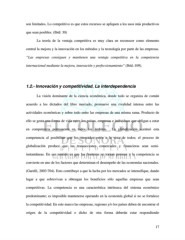 son limitados. Lo competitivo es que estos recursos se apliquen a los usos más productivos que sean posibles. (Ibíd: 30) La teoría de la ventaja competitiva es muy clara en reconocer como elemento central la mejora y la innovación en los métodos y la tecnología por parte de las empresas. “Las empresas consiguen y mantienen una ventaja competitiva en la competencia internacional mediante la mejora, innovación y perfeccionamiento” (Ibíd.:109). 1.2.- Innovación y competitividad. La interdependencia La visión dominante de la ciencia económica, donde todo se organiza de común acuerdo a los dictados del libre mercado, promueve una rivalidad intensa entre las actividades económicas y sobre todo entre las empresas de una misma rama. Producto de ello se gesta una forma de vida entre los países, empresas e individuos que obligan a estar en competencia permanente en todos los ámbitos. La globalización acentuó esta competencia al posibilitar que los mercados estén a la vista de todos; el proceso de globalización produce que las transacciones comerciales y financieras sean semi- instantáneas. En ese sentido es que las fronteras se tornan porosas y la competencia se convierte en uno de los factores que determinan el desempeño de las economías nacionales. (Garelli, 2003:704). Esto contribuye a que la lucha por los mercados se intensifique, dando lugar a que sobrevivan u obtengan los beneficios sólo aquellas empresas que sean competitivas. La competencia es una característica intrínseca del sistema económico predominante; es imposible mantenerse operando en la economía global si no se fortalece la competitividad. En este marco las empresas, regiones y/o los países deben de encontrar el origen de la competitividad o dicho de otra forma deberán estar respondiendo 17