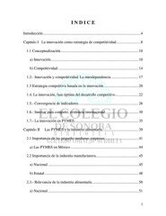 I N D I C E Introducción ....................................................................................................4 Capitulo I La innovación como estrategia de competitividad.........................8 1.1 Conceptualización................................................................................10 a) Innovación..........................................................................................10 b) Competitividad...................................................................................14 1.2.- Innovación y competitividad. La interdependencia ............................17 1.3 Estrategia competitiva basada en la innovación....................................20 1.4. La innovación, fase óptima del desarrollo competitivo........................22 1.5.- Convergencia de indicadores. ............................................................26 1.6.- Innovar para competir, evidencia internacional..................................30 1.7.- La innovación en PYMES..................................................................35 Capitulo II Las PYMES y la industria alimentaría.....................................39 2.1 Importancia de las pequeño-medianas empresas ..................................41 a) Las PYMES en México ......................................................................44 2.2 Importancia de la industria manufacturera............................................45 a) Nacional .............................................................................................45 b) Estatal ................................................................................................48 2.3.- Relevancia de la industria alimentaría................................................50 a) Nacional .............................................................................................51 2