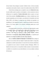 diversos factores. Estas estrategias se ejecutan a distintos niveles, en diversos mercados, con productos seleccionados al interior o exterior de la unidad económica (Horta, 2003:10). Existen diversas estrategias para ser competitivos como son la Reducción de costos, la cual es factible cuando los productos son homogéneos o existen economías de escala no utilizadas por los competidores. Productos diferenciados donde se apuesta a un mayor valor del bien producido. Flexibilidad productiva que se adecua a industrias que sirven mercados segmentados por nivel de ingreso o por preferencia de consumidores entre otras (Horta, 2003:11). Sin embargo la estrategia que más dividendos está aportando en la actualidad por el valor agregado que genera, es aquella que está basada en la innovación; incluso es la de mayor empleo en las economías consideradas punteras por su nivel competitivo. La estrategia basada en la innovación va más allá de una simple imitación o copia a un competidor, es aplicar el conocimiento de las mejoras básicas que surgen de manera esporádica, y que marcan la trayectoria a seguir (Vázquez Barquero, 2005:80). Generalmente la mayoría de las mejoras realizadas son pequeñas y en apariencia poco significativa; sin embargo al acumularse crean una ventaja competitiva. Entre los beneficios competitivos adjudicados a la innovación como estrategia se encuentra el ser una fuerza motriz que impulsa la empresa hacia objetivos a largo plazo, conduciendo en el ámbito macroeconómico a la renovación de las estructuras industriales y a la aparición de nuevos sectores de actividad económica (Domínguez, 2006:3). Los beneficios de la innovación no se circunscriben al ámbito económico o de posicionamiento; es también el ser reconocido con una actitud diferente a la de otras unidades económicas del mismo giro. 21