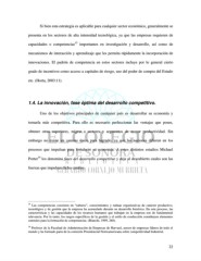 Si bien esta estrategia es aplicable para cualquier sector económico, generalmente se presenta en los sectores de alta intensidad tecnológica, ya que las empresas requieren de 15 capacidades o competencias importantes en investigación y desarrollo, así como de mecanismos de interacción y aprendizaje que les permita rápidamente la incorporación de innovaciones. El padrón de competencia en estos sectores incluye por lo general cierto grado de incentivos como acceso a capitales de riesgo, uso del poder de compra del Estado etc. (Horta, 2003:11). 1.4. La innovación, fase óptima del desarrollo competitivo. Uno de los objetivos principales de cualquier país es desarrollar su economía y tornarla más competitiva. Para ello es necesario perfeccionar las ventajas que posee, obtener otras superiores, migrar a sectores y segmentos de mayor productividad. Sin embargo no existe un camino único para lograrlo, ya que las naciones difieren en los procesos que impulsan para fortalecer su economía. A estos distintos estadios Michael 16 Porter los denomina fases del desarrollo competitivo y deja al descubierto cuales son las fuerzas que impulsan dicho cambio. 15 Las competencias consisten en “saberes”, conocimientos y rutinas organizativas de carácter productivo, tecnológico y de gestión que la empresa ha acumulado durante su desarrollo histórico. En este proceso, las características y las capacidades de los recursos humanos que trabajan en la empresa son de fundamental relevancia. Por lo tanto, los rasgos específicos de la gestión y el estilo de conducción constituyen elementos centrales para la formación de competencias. (Bianchi, 1999, 268). 16 Profesor de la Facultad de Administración de Empresas de Harvard, asesor de empresas líderes de todo el mundo y ha formado parte de la comisión Presidencial Norteamericana sobre competitividad Industrial. 22