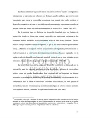 17 Las fases determinan la posición de un país en los sectores sujetos a competencia internacional y representan un esfuerzo por destacar aquellos atributos que son los más importantes para elevar la prosperidad económica. Aun cuando estos ciclos explican el desarrollo competitivo nacional es inevitable que algunos aspectos importantes se queden al margen o bien que ningún país embone exactamente en un solo ciclo. (Porter: 1991:677) En la primera etapa se distingue un desarrollo impulsado por los factores de producción, donde se obtiene una ventaja competitiva de manera casi exclusiva en los elementos básicos, ubicación, recursos naturales, mano de obra barata, clima etc.. En esta etapa la ventaja competitiva única es el precio, ya que el uso innovaciones es prácticamente nulo […] Mientras en el segundo periodo las economías son impulsadas por la inversión, lo cual se traduce en la construcción de instalaciones modernas, eficaces y equipadas con la mejor tecnología disponible en el mercado mundial. Imitan lo que en otras latitudes se está utilizando, más no invierten en general su propio conocimiento. (Ibíd. 680) La tercera fase dentro de las etapas del desarrollo competitivo, es impulsada por la innovación, aquí las empresas adquieren-mejoran tecnología y métodos de otros países, incluso crean sus propias innovaciones. Las empresas del país impulsan las últimas novedades en tecnología de productos y de procesos, en marketing y en otros aspectos de la competencia. Esto es debido a condiciones favorables en la demanda, un buen parque de proveedores, factores especializados y la existencia en el país de sectores conexos permiten a las empresas innovar y mantener la capacidad de innovación (Ibíd.. 687) 17 Es necesario aclarar que al momento de analizar el nivel competitivo de una economía nacional de manera agregada, se tiene que estar conciente de que el comportamiento de la misma va ha variar en su interior, presentando sectores muy desarrollados y vanguardistas, mientras otros están estáticos o rezagados. Esto se debe a que ninguna economía puede ser competitiva en todas sus actividades. 23