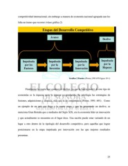 competitividad internacional, sin embargo a manera de economía nacional agrupada aun les falta un tramo que recorrer (véase gráfica 2) Grafico 2 Fuente: (Porter,1991:678 figura 10-1) Finalmente la cuarta fase conduce al declive, ya que la fuerza motriz de este tipo de economías es la riqueza, pero la riqueza ya producida. Se privilegia las estrategias de fusiones, adquisiciones y alianzas, más que la de competencia (Porter, 1991: 691) . Como un ejemplo de un país que llego a la cuarte etapa y que ha presentado un declive, se menciona Gran Bretaña que a mediados del Siglo XIX, era la economía líder en innovación y que actualmente se encuentra en el lugar doce. Una nación puede estar variando de un lugar a otro dentro de la tipología del desarrollo competitivo, pero aquellas que lograr posicionarse en la etapa impulsada por innovación son las que mejores resultados presentan. 25