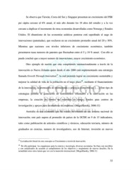 Se observa que Taiwán, Corea del Sur y Singapur presentan un crecimiento del PIB/ per cápita cercano al 6% anual, el más alto durante los 10 años del estudio y a la vez cercano a duplicar el incremento de otras economías desarrolladas como Noruega y Estados Unidos. El dinamismo de las economías asiáticas punteras está supeditado al auge de innovaciones (patentadas), que oscilaron en un crecimiento promedio anual del 20 y 30%. Mientras que naciones con niveles inferiores de crecimiento económico, también presentaron tasas menores de patentes que fluctuaban entre el 5 y 10 % anual. Con ello se puede concluir que a mayor numero de innovaciones, mayor crecimiento económico. Otro ejemplo de nación que esta compitiendo internacionalmente a través de la innovación es Nueva Zelanda quien desde el año 2000 está implementando una estrategia 27 llamada Growth Through Innovation , la cual pretende lograr un crecimiento sustentable y 28 mejorar la calidad de vida de la población en el largo plazo , mediante el financiamiento de la innovación, la promoción de instituciones y prácticas competitivas. [….] Este tipo de estrategias permite la generación de instrumentos orientados a la innovación en las empresas, la creación de fondos de inversión de riesgo, fondos para centros de investigación y apoyos para incubadoras de empresas. (Moguillansky, 2006:12) Australia es una economía que ha venido invirtiendo en sus sistema nacional de innovación; este país supera al promedio de países de la OCDE en 9 de 15 indicadores, tales como publicación de artículos científicos y técnicos, educación terciaria, número de graduados en ciencias, numero de investigadores, uso de Internet, inversión en nuevos 27 La traducción literal de este concepto es Crecimiento a través de innovación. 28 En ella participan los organismos para la ciencia y tecnología, diversas secretarias. Su fines son movibles y son actualizados de acuerdo al cumplimiento de los objetivos y surgimiento de nuevos desafíos. En la actualidad estos retos tienen que ver con la inserción internacional. (Moguillansky, 2006:11) 32