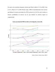 En cuanto a las economías emergentes, tenemos que China le dedicó el 1.23 en 2002, Corea el 2.91 y Brasil el .97 en 2003 (Paredes López, 2006:3) Coincidentemente estas naciones que destinan los mayores porcentaje de su PI B a promover la I & D (lo cual se traduce en mayores posibilidades de innovar) son las que detentan los primeros lugares en competitividad. Gasto porcentual del PIB invertido en Investigación y desarrollo. Grafico 6 Fuente: (Paredes López, 2006:5) 34