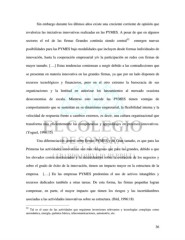 Sin embargo durante los últimos años existe una creciente corriente de opinión que revaloriza las iniciativas innovativas realizadas en las PYMES. A pesar de que en algunos 32 sectores el rol de las firmas Grandes continúa siendo central emergen nuevas posibilidades para las PYMES bajo modalidades que incluyen desde formas individuales de innovación, hasta la cooperación empresarial y/o la participación en redes con firmas de mayor tamaño. [….] Estas tendencias comienzan a surgir debido a las contradicciones que se presentan en materia innovativa en las grandes firmas, ya que por un lado disponen de recursos tecnológicos y financieros, pero en el otro extremo la burocracia de sus organizaciones y la lentitud en autorizar los lanzamientos al mercado ocasiona deseconomias de escala. Mientras esto sucede las PYMES tienen ventajas de comportamiento que se sustentan en su dinamismo empresarial, la flexibilidad interna y la velocidad de respuesta frente a cambios externos, es decir, una cultura organizacional que transforma más eficientemente las competencias y aprendizajes en procesos innovativos. (Yoguel, 1996:15) Una diferenciación central entre firmas PYMES y de Gran tamaño, es que para las Primeras las actividades innovativas son más riesgosas que para las grandes, debido a que los elevados costos involucrados y la incertidumbre sobre la evolución de los negocios y sobre el grado de éxito de la innovación, tienen un impacto mayor en la estructura de la empresa. [….] En las empresas PYMES predomina el uso de activos intangibles y recursos dedicados también a otras tareas. De esta forma, las firmas pequeñas logran compensar, en parte, el mayor impacto que tienen los riesgos y las incertidumbres asociadas a las actividades innovativas sobre su estructura. (Ibíd, 1996:18) 32 Tal es el caso de las actividades que requieren inversiones relevantes y tecnologías complejas como aeronáutica, energía, química básica, telecomunicaciones, automotriz, etc. 36