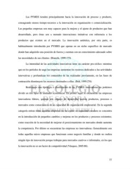Las PYMES tienden principalmente hacia la innovación de proceso y producto, consagrando menos tiempo-recursos a la innovación en organización o comercialización. Las pequeñas empresas son muy capaces para la mejora y el ajuste de productos que han desarrollado, pero éstas son a menudo innovaciones imitativas con referencia a los productos que existen en el mercado. La innovación auténtica, por otra parte, es habitualmente introducida por PYMES que operan en un nicho específico de mercado donde han adquirido una posición de fuerza y cuentan con un conocimiento adecuado sobre las necesidades de sus clientes. (Bianchi, 1999:175) La intensidad de las actividades innovativas tiene un carácter pro-cíclico: mientras que en los períodos de auge las empresas aumentan los recursos dedicados a las actividades innovativas y profundizan los contenidos de las realizadas previamente, en las fases de contracción disminuyen los recursos destinados a ellas. (Ibíd, 1999:276) Realizando una tipología o clasificación de las PYMES innovadoras las podemos dividir en tres tipos de unidades económicas: En primer lugar se encuentran las empresas innovadoras líderes, quienes son capaces de desarrollar nuevos productos, procesos o mercados como consecuencia de su capacidad de organización empresarial. En la segunda categoría entran todas aquellas empresas en las cuales su capacidad creadora se concentra en la introducción de pequeños cambios y mejoras en los productos y procesos existentes; como reacción de la necesidad de mejorar el posicionamiento en mercados donde aumenta la competencia. Por último se encuentran las empresas no innovadoras. Generalmente son todas aquellas micro empresas que funcionan como negocio familiar y donde no realiza ningún tipo de innovación porque trabajan para mercados cautivos o informales, en los que la innovación no es un factor de competitividad (Vázquez, 2005:88). 37
