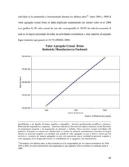 41 actividad se ha mantenido e incrementado durante los últimos años : entre 1994 y 1999 el valor agregado censal bruto se había triplicado manteniendo ese mismo valor en el 2004 (ver gráfica 9). El valor censal de este año correspondió al 28.9% de toda la economía el cual es el mayor porcentaje de todas las actividades económicas y muy superior al segundo lugar (minería) que generó el 13.7% (INEGI, 2004) Valor Agregado Censal Bruto (Industria Manufacturera Nacional) Grafico 9 (Elaboración propia) inmobiliarios y de alquiler de bienes muebles e intangibles, Servicios profesionales-científicos y técnicos, Dirección de corporativos y empresas, Servicios educativos, Servicios de salud y asistencia social, Servicios de alojamiento temporal y de preparación de alimentos y bebidas, Otros servicios excepto actividades del gobierno. Tomando en cuenta esta clasificación es cuando la industria manufacturera concentra al mayor número de personal ocupado y la cantidad más grande de valor agregado; ya que si bien es cierto que los servicios y comercio de manera agrupados en uno solo generarían mayor cantidad de personal ocupado y valor agregado, al ser desglosados (como se contabilizan) no se equiparan a las manufacturas. 41 Al referirse a los últimos años, se hace mención al ciclo comprendido por los censos económicos de 1994, 1999 y 2004, no existe información mas actualizada ya que siguiente censo económico se realizara hasta el 2009. 46
