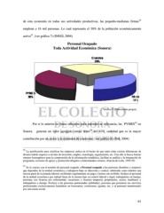 52 de esta economía en todas sus actividades productivas, las pequeño-medianas firmas emplean a 16 mil personas. Lo cual representa el 38% de la población económicamente 53 activa . (ver gráfica 7) (INEGI, 2004) Personal Ocupado Toda Actividad Económica (Sonora) Grafico 7 (Elaboración propia) 54 Por si lo anterior no fuera suficiente para entender su relevancia, las PYMES en 55 Sonora generan un valor agregado censal bruto del 42%, cantidad que es la mayor contribución por un sector a la economía de sonorense. (ver gráfico 8) (Ibíd, 2004) 52 La justificación para clasificar las empresas radica en el hecho de que entre éstas existen diferencias de diversa índole respecto a niveles de inversión, empleo, tecnología, organización, etc. Con ello se busca formar estratos homogéneos para la comprensión de la información estadística, facilitar su análisis y la integración de programas, acciones de apoyo y promoción dirigidos a determinados estratos. (García de León, 1993:25) 53 Se le conoce con el nombre de personal ocupado a Personal ocupado a las personas (hombres y mujeres) que dependen de la unidad económica y trabajaron bajo su dirección y control, cubriendo como mínimo una tercera parte de la jornada laboral, recibiendo regularmente un pago e incluso sin recibirlo. Incluye al personal de la unidad económica que trabajó fuera de la misma bajo su control laboral y legal; trabajadores en huelga; personas con licencia por enfermedad, vacaciones o licencia temporal; propietarios, socios, familiares y trabajadores a destajo. Excluye a las personas pensionadas (jubiladas), personas que prestaron sus servicios profesionales exclusivamente basándose en honorarios, comisiones, igualas, etc. y al personal suministrado por otra razón social. 61