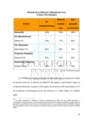 Posición de la Industria Alimentaría Local (Valores Porcentuales) Personal Valor No. Estrato ocupado agregado Establecimientos total censal bruto Hermosillo 100% 100% 100% Ind. Manufacturera (Sector 31) 12% 17% 30% Ind. Alimentaría (Sub Sector 311) 42% 23% 12% Productos Panadería (Rama 3118) 84% 51% 34% Panificación Industrial (Clase 311811) 60% 57% 76% Cuadro 1 (Elaboración propia) Las PYMES de la industria alimentaria de Hermosillo (que es el campo de estudio 58 del presente texto) son el segmento de empresas más pujante y representativas dentro de la industria alimentaria; al generar 2,589 empleos de un total de 5,809, equivalente al 44 % de la población económicamente activa del sub-sector 311 (Véase Grafico 21). (INEGI, 2004) 58 La unidad económica o empresa es aquella organización que bajo una sola entidad propietaria o controladora, combina acciones y recursos para realizar actividades de producción de bienes, compra-venta de mercancías o prestación de servicios, sea con fines mercantiles o no. La empresa puede ser definida a diversos niveles geográficos: país, estado, municipio, localidad o área geoestadística básica, según se requiera. (INEGI, 2004) 65