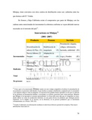 Minipay, tiene convenios con otros centros de distribución como son: cafeterías entre las que destaca café D´ Volada. En Sonora y Baja California existe el compromiso por parte de Minipay con las cadenas antes mencionadas de incrementar la cobertura conforme se vayan abriendo nuevas 71 sucursales en el noroeste del país . 72 Innovaciones en Minipay (2001 -2007) Producto Proceso Servicio Presentación: etiqueta, Diversificación de Modificación de códigos, información, sabores (4) Pays ( I ) maquinaria ( I ) hacienda, salubridad ( E ) Nuevos Sabores (2) Adaptación de Incrementales Panques ( I ) equipo ( I ) Logo y Nombre ( E ) Distribución ( I ) Presentación Individual (Pay y Producción en serie Radicales Panque) ( E ) ( I ) Total 7 3 4 Distribución Sinaloa y En proceso: B.C.S 71 Como aquí se ha mencionado Minipay cuenta con una ventaja competitiva al enfocar la presentación de sus productos en porciones individuales, lo que facilita su manejo, distribución, aceptación por el consumidor y por supuesto alarga la vida en anaqueles. La mayoría de las grandes firmas operando en este giro se enfocan en un producto en presentación familiar y seccionada a su interior, porciones para varias personas. Mientras que Minipay le ha apostado al consumo personalizado. La firma debe tener algo que el competidor no tiene, puede radicar en costos de producción inferiores, en una gama diversa de productos que obtengan precios superiores, en la calidad, en el servicio, en la eficiencia, en un proceso productivo que se incrementa constantemente, etc. (Porter, 1991: 45). 72 Cuadro 5 elaborado con información recabada en entrevista al director general de la empresa. Para mayor información véase anexo 8. 76