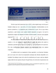 Foto 1 El año en que inició operaciones fue en 1992. La idea original surge a raíz de que el fundador trabajó por seis o siete años en el sector maquilador, familiarizándose con los procesos productivos y la maquinaria para la fabricación en serie. Una vez que obtuvo experiencia y pudo ahorrar cierto capital, decidió emprender un negocio. Así nació la inquietud de comprar una máquina de tortillas de harina (usada) y activarse como pequeño 77 empresario . Dos años después de fundada abre la primera sucursal; a los cinco años empezaron a exportar y a los seis inaugura la segunda filial. Es a partir del séptimo año cuando se comienzan a presentar innovaciones en los productos y consecuentemente en los procesos. Con estas modificaciones Becarel comenzó una transformación hacia una empresa competitiva. La tortillería inició con maquinaria de baja capacidad y con funciones limitadas, pero con el paso de los años fue incorporando tecnología más eficiente disponible en la localidad. Sin embargo al paso de los años fue insuficiente por lo que se optó por adquirir equipo traído de otras regiones del país. De igual forma a los ocho años de operaciones esta 77 Cabe mencionar que en los principios de esta empresa se inicio con maquinaria de segunda mano, y que el propietario carecía de experiencia en la producción de tortillas de harina. 79