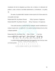 Actualmente del total de trabajadores que labora, diez se dedican a la elaboración del producto y cuatro se ubican en actividades administrativas y de distribución. (ver gráfica 28) En cuanto a la productividad y haciendo el mismo ejercicio de la Pyme anterior las cosas quedan como sigue: Productividad 1992 = Kg. Harina / Personal 20 Kg / 4 personas = 5 kg/persona Productividad 2007 = Kg. Harina / Personal 240 kg / 10 personas = 24 kg/persona Como puede percatarse la productividad por trabajador aumentó sensiblemente en un lapso de quince años. (ver gráfica 26) . Si se analiza la productividad por hora las cifras se disparan quedando: Productividad 1992 = Kg. Harina / Hora 20 Kg / 10 Horas = 2 kg / hora Productividad 2007 = Kg. Harina / Hora 240 kg / 10 Horas = 24 kg / hora La productividad de tortillería Becarel por hora aumentó en más de mil por ciento en el mismo periodo. 84