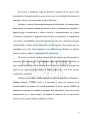 En el cuarto se estudian las etapas del desarrollo competitivo de las naciones. Esta periodización se formula tomando en cuenta la innovación como indicador determinante de esas etapas, así como las consecuencias positivas del mismo. . La quinta y sexta sección constituyen una especie de digresión a la secuencia hasta ahora seguida; sin embargo creemos que lo que se toca es importante para visualizar el papel que juega la innovación en el contexto actual de la economía mundial. En la quinta se abordan los tabuladores de organismos internacionales, que cuantifican la competitividad e innovación a nivel global por países. En especial se presentan dos evaluaciones (una para competitividad y otra para innovación) donde es posible apreciar cómo naciones que son catalogados con un alto nivel competitivo, son también las que detentan los primeros lugares en cuanto al número e importancia de sus innovaciones. En la sexta se exponen estudios internacionales de empresas que han invertido en innovación y los resultados que han obtenido en cuanto a competitividad en relación con otras unidades económicas que no invirtieron en este proceso. También se examinan los proyectos que impulsan la innovación y el fomento que se da a I & D en naciones consideradas competitivas Finalmente en el séptimo y último apartado se analiza la situación de las Pequeñas y Medianas Empresas (PYMES) frente a la innovación y como ésta repercute en la competitividad de las mismas. Se pretende desmitificar la idea de que las PYMES son empresas poco abiertas a los cambios tecnológicos, a las innovaciones y más reacias a una transformación de su cultura laboral. Se abordara la naturaleza de las innovaciones presentes en las pequeño-medianas unidades económicas. 9