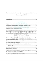 (O FREUR GH OD FRQWULEXFLyQ GLUHFWD RUGLQDULD SHUVRQDO \ OD FUHDFLyQ GHO FDWDVWUR HQ 6RQRUD 3ULPHURV HQVD\RV , ,QWURGXFFLyQ««««««««««««««««««««««««««««, &DStWXOR , $QWHFHGHQWHV GH OD FUHDFLyQ GHO FDWDVWUR««««««« ««««« 'HVFULSFLyQ GHO SUR\HFWR OLEHUDO D SDUWLU GH OD &RQVWLWXFLyQ GH ««««« « /D LQIOXHQFLD GHO OLEHUDOLVPR HVSDxRO HQ OD ILVFDOLGDG VRQRUHQVH«««««« « &RQWH[WR SROtWLFR D QLYHO QDFLRQDO \ HVWDWDO««««««««««««««« « &RQWH[WR SROtWLFR \ HFRQyPLFR HQ 6RQRUD««««««««««««« «« /HJLVODFLyQ ILVFDO HQ 6RQRUD /D QHFHVLGDG GH HVWDEOHFHU OD FRQWULEXFLyQ GLUHFWD /D FRQWULEXFLyQ GLUHFWD DSDUHFH HQ OD OHJLVODFLyQ VRQRUHQVH««««««« « &DStWXOR ,, (O FDWDVWUR GH «««««««««««««««««««« 'HILQLFLyQ GH FDWDVWUR \ ULTXH]D«««««««««««««««««« « $QWHFHGHQWHV D OD FUHDFLyQ GHO FDWDVWUR GH «««««««««««« « (O FDVR HVSDxRO FRPR DQWHFHGHQWH««««««««««««««««« « $QWHFHGHQWHV D OD &LUFXODU GHO GH IHEUHUR \ /H\ GH &RQWULEXFLyQ 'LUHFWD GH «««««««««««««««««««««««« « &LUFXODU GHO GH IHEUHUR GH ««««««««« «««««« «« &DUDFWHUtVWLFDV GHO FDWDVWUR«««««««««««««««««««« « ¢)XH UHDOPHQWH XQ FDWDVWUR" ¢&XPSOLy FRQ OR TXH EXVFDED HO JRELHUQR" 4XHMDV SRU LQH[DFWLWXG \ RFXOWDFLyQ GH GDWRV«««««««««««««« )DOWD GH JHQWH FDSDFLWDGD SDUD HODERUDU HO FDWDVWUR«« ««««««««««