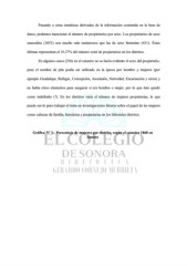 3DVDQGR D RWUDV WHPiWLFDV GHULYDGDV GH OD LQIRUPDFLyQ FRQWHQLGD HQ OD EDVH GH GDWRV SRGHPRV PHQFLRQDU HO Q~PHUR GH SURSLHWDULRV SRU VH[R /RV SURSLHWDULRV GH VH[R PDVFXOLQR VRQ PXFKR PiV QXPHURVRV TXH ODV GH VH[R IHPHQLQR eVWDV ~OWLPDV UHSUHVHQWDQ HO GHO Q~PHUR WRWDO GH SURSLHWDULRV HQ ORV GLVWULWRV (Q DOJXQRV FDVRV HQ HO FDWDVWUR QR VH KDFtD HYLGHQWH HO VH[R GHO SURSLHWDULR SXHV HO QRPEUH GH SLOD SRGtD VHU XWLOL]DGR HQ OD pSRFD SRU KRPEUH \ PXMHUHV SRU HMHPSOR *XDGDOXSH 5HIXJLR &RQFHSFLyQ $VFHQVLyQ 1DWLYLGDG (QFDUQDFLyQ \ RWURV \ QR KDEtD RWURV HOHPHQWRV SDUD DVHJXUDU VL HUD KRPEUH R PXMHU SRU OR TXH pVWH TXHGy FRPR LQGHILQLGR " (Q ORV GLVWULWRV YDUtD HO Q~PHUR GH PXMHUHV SURSLHWDULDV OR TXH SXHGH VHUYLU SDUD WUDEDMDU HO WHPD HQ LQYHVWLJDFLRQHV IXWXUDV VREUH HO SDSHO GH ODV PXMHUHV FRPR FDEH]DV GH IDPLOLD KHUHGHUDV \ SURSLHWDULDV HQ ORV GLIHUHQWHV GLVWULWRV *UiILFD 1 3RUFHQWDMH GH PXMHUHV SRU GLVWULWR VHJ~Q HO FDWDVWUR HQ 6RQRUD