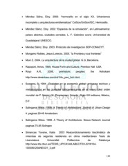 Méndez Sáinz, Eloy. 2000. “hermosillo en el siglo XX. Urbanismos incompleto y arquitecturas emblematicas” ColSon/UniSon/ISC, Hermosillo. Méndez Sáinz, Eloy. 2002 “Espacios de la simulación”, en Latinoamerica: paises abiertos, ciudades cerradas. L. F. Cabrales coord. Universidad de Guadalajara/ UNESCO. Méndez Sáinz, Eloy. 2003. Protocolo de investigacion SEP-CONACYT. Mungarro Robles, Jesus Lorenzo. 2005. “la Frontera y sus fronteras” Muxí Z. 2004. La arquitectura de la ciudad global. G.G, Barcelona. Rapoport, Amos, 1969, House Form and Culture, Prentice Hall USA Royo A.R., 2008, prehistoric peoples: the Hohokam http://www.desertusa.com/ind1/du_peo_hoh.html Sassens, S. 1994. Ciudades en la economía global: enfoques teóricos y metodológicos en las ciudades latinoamericanas en el nuevo (des) orden mundial. de P. Navia y M. Zimmerman, Coords., Siglo XXI editores, México, D.F. Salingaros Nikos. 1999. A Theory of Architecture. Journal of Urban Design 4. paginas 29-49 Amsterdam. Salingaros Nikos. 1999. A Theory of Architecture. Nexus Network Journal paginas 75-85 Solingen Simancas Yovane, Katia 2003 Reacondicionamiento bioclimático de viviendas de segunda residencia en clima mediterráneo Tesis de Licenciatura Universitat Politecnica de Catalunya http://www.tdx.cbuc.es/TESIS_UPC/AVAILABLE/TDX-0216104- 100306//20ANEXO1_2.pdf 120