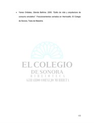 Yanes Ordiales, Glenda Bethina. 2005. “Estilo de vida y arquitectura de consumo emulativo”. Fraccionamientos cerrados en Hermosillo. El Colegio de Sonora, Tesis de Maestría. 122