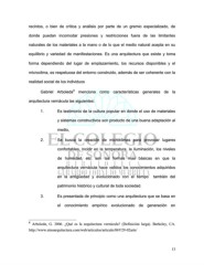 recintos, o bien de crítica y análisis por parte de un gremio especializado, de donde puedan incomodar presiones y restricciones fuera de las limitantes naturales de los materiales a la mano o de lo que el medio natural acepta en su equilibrio y variedad de manifestaciones. Es una arquitectura que existe y toma forma dependiendo del lugar de emplazamiento, los recursos disponibles y el microclima, es respetuosa del entorno construido, además de ser coherente con la realidad social de los individuos 6 Gabriel Arboleda menciona como características generales de la arquitectura vernácula las siguientes: 1. Es testimonio de la cultura popular en donde el uso de materiales y sistemas constructivos son producto de una buena adaptación al medio, 2. Se busca la creación de microclimas para provocar lugares confortables, incidir en la temperatura, la iluminación, los niveles de humedad, etc. son las formas mas básicas en que la arquitectura vernácula hace validos los conocimientos adquiridos en la antigüedad y evolucionado con el tiempo también del patrimonio histórico y cultural de toda sociedad. 3. Es presentada de principio como una arquitectura que se basa en el conocimiento empírico evolucionado de generación en 6 Arboleda, G. 2006. ¿Qué es la arquitectura vernácula? (Definición larga). Berkeley, CA. http://www.etnoarquitectura.com/web/articulos/articulo/06V29-02arts/ 13