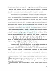 planeación una relación con responder a exigencias recurrentes de los moradores o dicho en otras palabras, hay una relación entre las ideas de Christopher Alexander y lo expuesto anteriormente acerca de la arquitectura vernácula. 8 Alexander analiza a profundidad su concepto de arquitectura atemporal y expone de manera detallada el proceso y elementos a partir de los cuales esta es generada y desarrolla la idea mediante la cual se puede llegar tanto a reconocer una construcción o elementos de la misma para luego reproducirla. Inicia con el planteamiento de la existencia de una inquietud innata en las personas por lograr una “calidad” en sus vidas, o como Alexander la nombra la Calidad Sin Nombre 9 (QWAN en sus siglas en ingles ) o bien en el desarrollo de si como ente colectivo, mediante la creación de lugares para la realización de sus actividades básicas “hay una calidad central la cual es el criterio raíz en el espíritu y la vida de un hombre, un pueblo, una construcción o en la naturaleza, esta calidad es objetiva y precisa...no puede ser fabricada, solo se genera indirectamente por las acciones 10 ordinarias de la gente”. A partir de esta búsqueda y encuentro con el QWAN se obtiene una herencia auto regenerada de conocimiento, el cual a su vez es permanentemente puesto a prueba, corregido y perfeccionado. Entonces, en este constante refinamiento de conocimiento y encuentro con soluciones puede gestarse una 8 Alexander Christopher, 1979,The Timeless Way Of Building, Oxford University Press, New York. 9 QWAN o Quality Without a Name inicialmente mencionado por Alexander en su libro El Modo Atemporal de Construir. En el desarrollo del texto lo seguiremos mencionando por sus siglas en ingles, por facilidad de uso. 10 Alexander Christopher, 1979,The Timeless Way Of Building, Oxford University Press, New York. 15