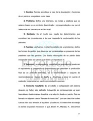1. Nombre. Permite simplificar la idea de la descripción y funciones de un patrón a una palabra o una frase 2. Problema. Define una intención, las metas y objetivos que se quieren lograr en un contexto determinado y correspondiendo a su vez al balance de las fuerzas que actúan en el. 3. Contexto. Es el medio que regula las determinantes que envuelven las circunstancias a las que responde la conformación de los patrones. 4. Fuerzas. Las fuerzas revelan los detalles de un problema y define las formas de gestión que deben de ser consideradas en presencia de las presiones que las generan. Una buena descripción de un patrón debe encapsular todas las fuerzas que tienen un impacto en el. 5. Solución. La descripción y concreción de una solución puede ser el equivalente al compendio de instrucciones que describen la producción final de un producto terminado, es la recomendación o conjunto de recomendaciones finales de diseño y directrices a tomar en cuenta el pretender implementar un patrón como solución concreta. 6. Contexto resultante. Es el estado o configuración del sistema después de haber sido aplicado, incluyendo las consecuencias ya sean favorables o desfavorables de aplicar una solución desde un patrón. Esto es llamado en algunos casos “fuerzas de resolución” por que describe cuales fuerzas han sido llevadas al equilibrio y cuales no. En este nivel de trabajo es donde se pueden reconocer lo que, Brown W., Malveau R., McCormick 17