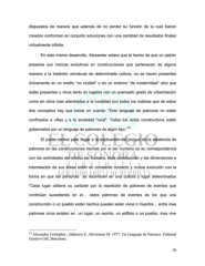dispuestos de manera que además de no perder su función de la cual fueron creados conforman en conjunto soluciones con una cantidad de resultados finales virtualmente infinita En este mismo desarrollo, Alexander aclara que el hecho de que un patrón presenta sus marcas evolutivas en construcciones que pertenecen de alguna manera a la tradición vernácula de determinada cultura, no se hacen presentes únicamente en un medio “no ciudad” o en un entorno “de modernidad” sino que están presentes y vivos tanto en lugares con un avanzado grado de urbanización como en otros mas adentrados a la ruralidad con todos los matices que de estos dos conceptos hay que tomar en cuenta: “Este lenguaje de patrones no están confinados a villas y a la sociedad “rural“. Todos los actos constructivos están 16 gobernados por un lenguaje de patrones de algún tipo.” El punto central para llegar a la explicación del porqué de la existencia de patrones en las construcciones hechas por el ser humano es su correspondencia con las actividades del mismo ser humano, toda construcción y las dimensiones e interrelación de sus áreas están en constante contacto y mutua evolución con la forma en que las personas se reconocen en una cultura y lugar determinados “Cada lugar obtiene su carácter por la repetición de patrones de eventos que continúan sucediendo en el… estos patrones de eventos de los que una construcción o un pueblo están hechos pueden estar vivos o muertos... entre mas patrones vivos existen en un lugar, un recinto, un edificio o un pueblo, mas vive 16 Alexander Cristopher., Ishikawa S., Silverstein M. 1977. Un Lenguaje de Patrones. Editorial Gustavo Gili, Barcelona. 20
