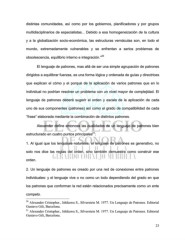 distintas comunidades, así como por los gobiernos, planificadores y por grupos multidisciplinarios de especialistas... Debido a esa homogeneización de la cultura y a la globalización socio-económica, las estructuras vernáculas son, en todo el mundo, extremadamente vulnerables y se enfrentan a serios problemas de 20 obsolescencia, equilibrio interno e integración.” El lenguaje de patrones, mas allá de ser una simple agrupación de patrones dirigidos a equilibrar fuerzas, es una forma lógica y ordenada de guías y directrices que explican el cómo y el porqué de la aplicación de varios patrones que en lo individual no podrían resolver un problema con un nivel mayor de complejidad. El lenguaje de patrones deberá sugerir el orden y escala de la aplicación de cada uno de sus componentes (patrones) así como el grado de compatibilidad de cada “frase” elaborada mediante la combinación de distintos patrones. Alexander define entonces las cualidades de un lenguaje de patrones bien 21 estructurado en cuatro puntos principales : 1. Al igual que los lenguajes naturales, el lenguaje de patrones es generativo, no solo nos dice las reglas del orden, sino también demuestra como construir ese orden. 2. Un lenguaje de patrones es creado por una red de conexiones entre patrones individuales: y el lenguaje vive o no como un todo dependiendo del grado en que los patrones que conforman la red estén relacionados precisamente como un ente competo. 20 Alexander Cristopher., Ishikawa S., Silverstein M. 1977. Un Lenguaje de Patrones. Editorial Gustavo Gili, Barcelona. 21 Alexander Cristopher., Ishikawa S., Silverstein M. 1977. Un Lenguaje de Patrones. Editorial Gustavo Gili, Barcelona. 23