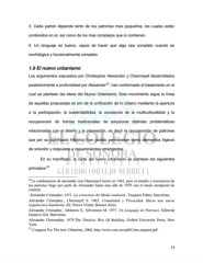 3. Cada patrón depende tanto de los patrones mas pequeños, los cuales están contenidos en el, así como de los mas complejos que lo contienen. 4. Un lenguaje es bueno, capaz de hacer que algo sea completo cuando es morfológica y funcionalmente completo. 1.6 El nuevo urbanismo Los argumentos expuestos por Christopher Alexander y Chermayef desarrollados 22 posteriormente a profundidad por Alexander , han conformado el basamento en el cual se plantean las ideas del Nuevo Urbanismo. Este movimiento sigue la línea de aquellas propuestas en pro de la unificación de lo urbano mediante la apertura a la participación, la sustentabilidad, la conciencia de la multiculturalidad y la recuperación de formas tradicionales de solucionar distintas problemáticas relacionadas con el diseño y la planeación, es decir la recuperación de patrones que por su significado histórico han podido permanecer como elementos lógicos de solución y respuesta a requerimientos emergentes. En su manifiesto, la carta del nuevo urbanismo se plantean los siguientes 23 principios: 22 La colaboracion de alexander con Chermayef inicio en 1963, pero el estudio y teorizacion de los patrones llego por parte de Alexander hasta mas alla de 1979 con el modo atemporal de contruir. Alexander Cristopher. 1971. La estructura del Medio Ambiente. Tusquets Editor, Barcelona. Alexander Cristopher., Chermayef S. 1963. Comunidad y Privacidad. Hacia una nueva arquitectura humanista. Ed. Nueva Visión, Buenos Aires. Alexander Cristopher., Ishikawa S., Silverstein M. 1977. Un Lenguaje de Patrones. Editorial Gustavo Gili, Barcelona. Alexander Christopher, 1979,The Timeless Way Of Building, Oxford University Press, New York. 23 Congress For The new Urbanism, 2006, http://www.cnu.oro/pdf/Carta espanol.pdf 24