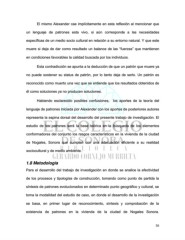 El mismo Alexander cae implícitamente en esta reflexión al mencionar que un lenguaje de patrones esta vivo, si aún corresponde a las necesidades específicas de un medio socio cultural en relación a su entorno natural. Y que este muere si deja de dar como resultado un balance de las “fuerzas” que mantienen en condiciones favorables la calidad buscada por los individuos. Esta contradicción se apunta a la deducción de que un patrón que muere ya no puede sostener su status de patrón, por lo tanto deja de serlo. Un patrón es reconocido como muerto una vez que se entiende que los resultados obtenidos de él como soluciones ya no producen soluciones. Habiendo esclarecido posibles confusiones, los aportes de la teoría del lenguaje de patrones iniciada por Alexander con los aportes de posteriores autores representa la espina dorsal del desarrollo del presente trabajo de investigación. El estudio de los patrones será la base teórica en la búsqueda de los elementos conformadores del conjunto los rasgos característicos en la vivienda de la ciudad de Nogales, Sonora que cumplen con una adecuación eficiente a su realidad sociocultural y de medio ambiente. 1.8 Metodología Para el desarrollo del trabajo de investigación en donde se analice la efectividad de los procesos y tipologías de construcción, tomando como punto de partida la síntesis de patrones evolucionados en determinado punto geográfico y cultural, se toma la modalidad del estudio de caso, en donde el desarrollo de la investigación se basa, en primer lugar de reconocimiento, síntesis y comprobación de la existencia de patrones en la vivienda de la ciudad de Nogales Sonora. 30