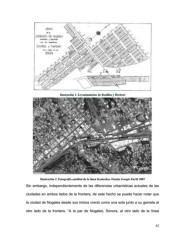 Ilustración 1. Levantamiento de Bonillas y Herbert Ilustración 2. Fotografía satelital de la línea fronteriza. Fuente Google Earth 2007 Sin embargo, independientemente de las diferencias urbanísticas actuales de las ciudades en ambos lados de la frontera, de este hecho se puede hacer notar que la ciudad de Nogales desde sus inicios creció como una sola junto a su gemela al otro lado de la frontera. “A la par de Nogales, Sonora, al otro lado de la línea 42