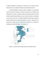 de Recinto Fiscalizado, sin embargo en la sección sur de la misma cuenca la mancha urbana en su constante crecimiento ya ha rebasado dicho límite. Un rasgo destacable por mencionar acerca de Nogales, es la importancia que ha ido sumando a lo largo de su historia en gran parte por su ubicación, estar emplazada en la frontera con Estados Unidos esta ciudad representa el inicio del corredor comercial Sonora-Sinaloa, aso como la puerta de acceso y comunicación con el país vecino del norte. La industria maquiladora también juega un papel de singular relevancia para la economía del estado no solo por su repercusión en la economía de la región sino en la influencia que ha ejercido en el crecimiento y morfología de la ciudad de Nogales. (Ver ilustración 9) Ilustración 7 Crecimiento Urbano de Nogales hasta 1990. Fuente: PMDUN ED: TBL 54
