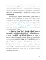tendencia de la economía global ha provocado una fuerte separación entre núcleos sociales, por un lado el miedo y el rechazo a las clases menos favorecidas dan nacimiento a patrones de comportamiento de casi paranoia y concepción del espacio social como algo que se da en el aislamiento o en la exclusión de grupos sociales “diferentes”. Esta vida del miedo en Estados Unidos no solo se acota en términos de vivienda, la forma de coexistencia en los espacios ya no es mas un cúmulo multiestructurado y diversificado, ahora el sentimiento de asecho, de la expectativa de que lo peor sucede en el momento menos pensado, abarca la problemática social en ámbitos tan diversificados como la sobrepoblación en las instituciones penitenciarias, deficiencias de las políticas del control de armas entre civiles y la violencia en las escuelas primarias. La búsqueda del progreso, anima a los países en vías de desarrollo a ponerse al día en las maneras en que se desenvuelve el orden económico actual, el caso de la globalización no es excepción. Es cada vez más evidente la inducción de México y sobre todo la región norte del país a la corriente del libre mercado y la competencia internacional. Se genera una fuerte subordinación a la influencia de dinámicas propias de los países industrializados en particular de Estados Unidos, a razón principalmente el hecho de la contigüidad geográfica que los une. Esto genera que la influencia trascienda de las políticas económicas, la proximidad de Estados Unidos tiene una fuerza que se manifiesta de múltiples maneras y en varios niveles. 60