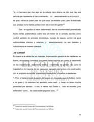 “si, mi hermana que vive aquí en la colonia pero afuera me dijo que hay una señora que representa al fraccionamiento… no… personalmente no la conozco… se que a veces se juntan para ver que cosas se necesita y eso, pero de este lado 60 que yo sepa no ha habido juntas ni con ella ni con otra gente” Esto se agudiza al haber determinado tipo de inconformidad generalizado hacia ciertas problemáticas sobre todo al interior de la cerrada, asuntos como control sanitario de animales domésticos, manejo de basura, control vial para automovilistas internos y externos, y estacionamiento, no son tratados y solucionados de manera colectiva . 3.6 Calidad En cuanto a la calidad de las viviendas, la percepción general de los habitantes es buena, sin embargo considera que puede haber mejorías en cuanto al tratamiento de las instalaciones, aislamiento térmico y materiales en general. Así como la inquietud en la mayoría de los casos por agregarle elementos a la construcción con el propósito de ampliar y desahogar los espacios ocupados ya existentes. “...Pero si hubiera tenido la opción de hacerla en otra parte, pues la hubiera hecho a mi gusto y no estuviera tan apretado como aquí... y luego no tienes mucha privacidad por ejemplo... o sea, si hablas muy fuerte o… todo se escucha ¿me 61 entiendes? Como… las casas están pegadas pues…“ 60 Vecina de la sección Encinos del Fraccionamiento Las Bellotas 61 Vecino de la sección Encinos del Fraccionamiento Las Bellotas 76