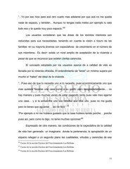 “...Yo por eso hice para acá otro cuarto mas adelante por que acá no me queda nada de espacio, y también... Aunque no tengas nada metes por ejemplo tu sala 62 todo eso y te queda muy poco espacio.“ Los usuarios consideran que las áreas de los recintos interiores son reducidas para sus necesidades, teniendo en cuenta la visión a futuro de las familias -en su mayoría jóvenes con expectativas de crecimiento en el número de sus miembros-. Es decir: existe un nivel amplio de aceptación de la vivienda a pesar de que se reconoce que existen ciertas carencias. El concepto adoptado por los usuarios acerca de a calidad de vida es llenada por la vivienda ofrecida, El entendimiento de “tener” un mínimo supera por mucho el “haber” del ideal de la vivienda. “...Pues eso de que lo necesita uno si lo necesita, pues económicamente uno que mas quisiera hacerse una casa como a su gusto, pero desgraciadamente…. no hay manera y pues muchas veces de estar pagando renta pues vale mas agarrar una casa… y si le encuentra uno sus detalles que dice uno, pues no me gusta 63 pero te tienes que aguantar… así de fácil.“ “Por ejemplo a mi me hubiera gustado que la casa hubiera tenido porche… porche 64 pues así, pero como le digo, no tenia muchas opciones“ Expresado de otra manera, las condiciones de la expectativa de la calidad de vida han generado un imaginario donde la pertenencia, la apropiación de un espacio relegan a un segundo plano las cualidades, virtudes y carencias de ese 62 Vecino de la sección Encinos del Fraccionamiento Las Bellotas 63 Vecino de la sección Encinos del Fraccionamiento Las Bellotas 64 Vecina de la sección Encinos del Fraccionamiento Las Bellotas 77