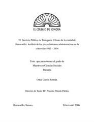 El Servicio Público de Transporte Urbano de la ciudad de Hermosillo: Análisis de los procedimientos administrativos de la concesión 1982 – 2004 Tesis que para obtener el grado de Maestro en Ciencias Sociales Presenta Omar García Román. Director de Tesis: Dr. Nicolás Pineda Pablos. Hermosillo, Sonora. Febrero del 2006.