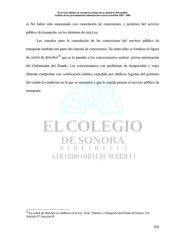 El servicio público de transporte urbano de la ciudad de Hermosillo: Análisis de los procedimientos administrativos de la concesión 1982 - 2004 e) No haber sido sancionado con cancelación de concesiones y permisos del servicio público de transporte, en los términos de ésta Ley. Las causales para la cancelación de las concesiones del servicio público de transporte también son parte del sistema de concesiones. De entre ellas se fortalece la figura 38 de cesión de derechos que se le permite a los concesionarios realizar previa autorización del Gobernador del Estado. Los concesionarios con problemas de incapacidad y vejez deberán comprobar con certificación médica expedida por médicos legistas del gobierno del estado la condición en la que se encuentra y que le impide prestar el servicio público de transporte. 38 La cesión de derechos se establece en la Ley 76 de Tránsito y Transporte del Estado de Sonora. Ver Artículo 97, fracción II. 105