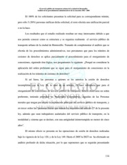 El servicio público de transporte urbano de la ciudad de Hermosillo: Análisis de los procedimientos administrativos de la concesión 1982 - 2004 El 100% de los solicitantes presentan la solicitud para su correspondiente trámite, pero sólo 3 (38%) personas ratifican dicha solicitud, el resto efectúa una ratificación parcial o no la hace. Los resultados que el estudio realizado resultan ser muy interesantes debido a que nos permite conocer como se estructura y se organiza realmente el servicio público de transporte urbano de la ciudad de Hermosillo. Tratando de complementar el análisis que se efectúa de los procedimientos administrativos, nos percatamos que para los trámites de cesiones de derechos se aplica parcialmente el procedimiento para el otorgamiento de concesiones, siguiendo ésta lógica, nos preguntamos lo siguiente ¿Porqué no considerar la aplicación del orden preferente que se sigue para el otorgamiento de concesiones en la realización de los trámites de cesiones de derechos? Si así fuera, las personas a quienes se les autoriza la cesión de derechos incumplirían con la Ley 56, la cual en su artículo 29 hace referencia que para el otorgamiento de concesiones de servicio público de transporte, deberá observarse un orden preferente, teniendo prioridad las Sociedades Cooperativas, seguidas de las Personas morales que tengan por objeto la explotación principal del servicio público de transporte, y en tercer orden las “personas físicas que reúnan los requisitos del articulo 27 de la presente ley, además que sean trabajadores asalariados del servicio público de transporte, en la modalidad y sistema que se declare, con una antigüedad ininterrumpida no menor de cinco años”. El mismo efecto se presenta en las operaciones de cesión de derechos realizadas bajo la vigencia de la Ley 120, y de la Ley 149. Hasta el 2005 la DGT no ha efectuado un análisis profundo de dicha situación, por lo que suponemos que se seguirán presentando 114