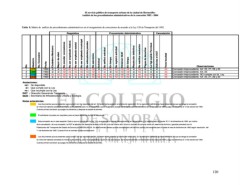Concesión improcedente. Art. 22, 27, 28 y 30 Concesión improcedente. Art. 22. Concesión improcedente. NO cumple con la Ley. Concesión improcedente. Art. 22, 27, 28 y 30 Observaciones. 120 Cancelación Tiene facultad no no no no Tabla 8. Matriz de análisis de procedimientos administrativos en el otorgamiento de concesiones de acuerdo a la Ley 120 de Transporte del 1992. Análisis de los procedimientos administrativos de la concesión 1982 - 2004 El servicio público de transporte urbano de la ciudad de Hermosillo: si Autoriza el DGT La Dgt expide Permisos si si si si nd si si si Pagos de derechos Se notofica resolución no si no no no si no Procemiento Administrativo Resolución definitiva En tiempo Dictámen SIUE Se registró solicitud si nd nd nd si nd nd nd si nd nd nd si nd nd nd Los documentos que se presentan para cumplir con los requisitos del art. 22 tienen fecha posterior a la fecha de resolución. En la resolución definitiva se hace referencia de que se otroga la concesión en virtud de haberse cancelado la misma a otra persona, pero no se especifica a quien ni por que no En tiempo Se ratificó solicitud no si si no no no no de la cancelación de una concesión, la DGT le adjudica los derechos de ésta; el 26 de Junio del mismo año, firma un contrato de compra venta con reserva de dominio y garantía prendaria con el si Solicitud si no no nd No sanciones nd nd nd no. No antecedentes penales no no si no. No ser empleado municipal no no si Requisitos No ser empleado estatal No ser empeleado federal. no. no. no no no no si si Cuando primero se tienen que pagar los derechos y despues se expide el permiso. El solicitante incumple con requisitos, pero se hace referencia de que es esposa de… Cuando primero se tienen que pagar los derechos y despues se expide el permiso. nd No exceder concesiones nd nd nd 11 de diciembre de 1992. Cuando firmó el contrato no era concesionario si Mayor de edad. si no si si Ciudadano Mexicano si no si SIUE : Secretaría de Infraestructura Urbana y Ecología. 1994 Fecha 1993 1992 1992 Que cumple con la Ley Que incumple con la Ley DGT : Dirección General de Transporte. Anotaciones: 372 No. Concesion Aleatorio 368 319 379 No disponible. Notas aclaratorias: 1 No. 2 3 4 nd : si : no :