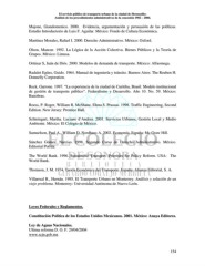 El servicio público de transporte urbano de la ciudad de Hermosillo: Análisis de los procedimientos administrativos de la concesión 1982 – 2004. Majone, Giandomenico. 2000. Evidencia, argumentación y persuasión de las políticas. Estudio Introductorio de Luis F. Aguilar. México: Fondo de Cultura Económica. Martínez Morales, Rafael I. 2000. Derecho Administrativo. México: Oxford. Olson, Mancur. 1992. La Lógica de la Acción Colectiva. Bienes Públicos y la Teoría de Grupos. México: Limusa. Ortúzar S, Juán de Diós. 2000. Modelos de demanda de transporte. México: Alfaomega. Radalet Egües, Guido. 1964. Manual de ingeniería y tránsito. Buenos Aires: The Reuben H. Donnelly Corporation. Reck, Garrone. 1997. “La experiencia de la ciudad de Curitiba, Brasil. Modelo institucional de gestión de transporte público”. Federalismo y Desarrollo. Año 10. No. 59. México: Banobras. Roess, P. Roger, William R. McShane, Elena S. Prassas. 1998. Traffic Engineering, Second Edition. New Jersey: Prentice Hall. Schteingart, Martha. Luciano d’Andrea. 2001. Servicios Urbanos, Gestión Local y Medio Ambiente. México: El Colegio de México. Samuelson, Paul A., William D. Nordhaus A. 2002. Economía. España: Mc Graw Hill. Sánchez Gómez, Narciso. 1998. Segundo Curso de Derecho Administrativo. México. Editorial Porrúa. The World Bank. 1996. Sustainable Transport. Priorities for Policy Reform. USA: The World Bank. Thomson, J. M. 1974. Teoría Económica del Transporte. España: Alianza Editorial, S. A. Villarreal R., Hernán. 1995. El Transporte Urbano en Monterrey. Análisis y solución de un viejo problema. Monterrey: Universidad Autónoma de Nuevo León. Leyes Federales y Reglamentos. Constitución Política de los Estados Unidos Mexicanos. 2001. México: Anaya Editores. Ley de Aguas Nacionales. Ultima reforma D. O. F. 29/04/2004 www.scjn.gob.mx 154