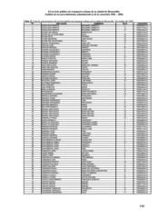 El servicio público de transporte urbano de la ciudad de Hermosillo: Análisis de los procedimientos administrativos de la concesión 1982 – 2004. Tabla 12. Lista de concesionarios del servicio público de transporte urbano de la ciudad de Hermosillo -Noviembre del 2004 No. APELLIDO(S) NOMBRE(S) RUTA CONCESION 1 ACEDO BUSTAMANTE BENJAMIN LAMBERTO 2 P020025HLLO. 2 ACEDO BUSTAMANTE BENJAMIN LAMBERTO 14 P020177HLLO. 3 ACEDO BUSTAMANTE BENJAMIN LAMBERTO 14 P020322HLLO. 4 ACOSTA DE GARCIA MARIA DELIA 1 P020017HLLO. 5 ACUÑA DE LA TORRE MEZA DELIA 19 P020377HLLO. 6 ACUÑA ORTIZ ROSARIO 19 P020297HLLO. 7 ACUÑA SIQUEIROS JOSE OSCAR 19 P020358HLLO. 8 ACUÑA VDA. DE ESTRADA DELIA 19 P020152HLLO. 9 AGUAYO VALENZUELA JOSE LUIS 17 P020214HLLO. 10 AGUILAR LEON GAMALIEL ANTONIO 4 P020426HLLO. 11 AGUILAR MENDIVIL MARGOT 18 P020129HLLO. 12 ALEGRIA VALENZUELA SIGIFREDO 2 P020030HLLO. 13 ALEGRIA VALENZUELA EBERTO 2 P020039HLLO. 14 ALEGRIA VALENZUELA SIGIFREDO 2 P020040HLLO. 15 ALVAREZ GARCIA LEOPOLDO 19 P020179HLLO. 16 AMAYA CORDOVA MARIA LUISA 6 P020256HLLO. 17 ARANDA SAAVEDRA MARTIN 11 P020543HLLO. 18 ARANDA SANABRIA GLORIA 6 P020310HLLO. 19 ARCE SEPULVEDA MARIA DEL CARMEN 18 P020090HLLO. 20 ARELLANO AGUILAR PEDRO 6 P020193HLLO. 21 ARIAS MIRANDA CARLOS 5 P020308HLLO. 22 ARREDONDO ACOSTA FRANCISCO 8 P020071HLLO. 23 ARRIAGA GUIZAR GERARDO 19 P020158HLLO. 24 ARROYO ARVIZU JOAQUIN 11 P020137HLLO. 25 ARTEAGA VELAZCO ROSALINA 15 P020299HLLO. 26 ARTECHE LOPEZ LUIS ANGEL 14 P020342HLLO. 27 AUTRIQUE ROMAGNOLI MARIA EVELIA 4 P020422HLLO. 28 AVILA ORDUÑO LESLIE 6 P020184HLLO. 29 AVILA PIMENTEL JESUS 3 P020045HLLO. 30 BADILLA MOLINA RODOLFO 13 P020271HLLO. 31 BALDENEGRO MARIA ANTONIETA 8 P020077HLLO. 32 BALDENEGRO ALCANTAR MARIA ANTONIETA 19 P020149HLLO. 33 BARCELO ENCINAS RAYMUNDO 6 P020196HLLO. 34 BARCELO PLAZA MARTINIANO 1 P020018HLLO. 35 BARRAZA HERNANDEZ JOSE 2 P020024HLLO. 36 BARRAZA HERNANDEZ REDUCINDO 15 P020067HLLO. 37 BECERRA BARRETO MARIO 2 P020032HLLO. 38 BELTRAN NEGRETE JORGE 19 P020146HLLO. 39 BERNAL SANTACRUZ JORGE LUIS 6 P020497HLLO. 40 BERNAL SANTACRUZ SONIA DELFINA 19 P020144HLLO. 41 BERNAL SANTACRUZ SONIA DELFINA 19 P020155HLLO. 42 BERNAL SANTACRUZ SONIA DELFINA 19 P020294HLLO. 43 BOBADILLA PARDO AMADO 18 P020123HLLO. 44 BRAVO GRANILLO FRANCISCO 1 P020008HLLO. 45 BRAVO VILLAESCUZA FRANCISCO JAVIER 9 P020350HLLO. 46 BRAVO VILLAESCUZA FRANCISCO JAVIER 9 P020538HLLO. 47 BRINGAS ESPINOZA ALEJANDRO 8 P020417HLLO. 48 BRINGAS ESPINOZA MARIA LUISA 11 P020211HLLO. 49 BRINGAS LOPEZ FIDEL 11 P020202HLLO. 50 BRINGAS LOPEZ JOSE FIDEL 11 P020209HLLO. 51 BURGOS PAREDES ARMANDO 6 P020182HLLO. 52 BURROLA ENCINAS ALONSO 4 P020398HLLO. 53 BUSTAMANTE ALCARAZ GUADALUPE 2 P020028HLLO. 54 BUSTAMANTE CAMOU MARGARITA 14 P020357HLLO. 55 BUSTAMANTE LOPEZ ALBERTO 4 P020393HLLO. 56 BUSTAMANTE LOPEZ ALBERTO 4 P020395HLLO. 57 BUSTAMANTE LOPEZ ARIEL 4 P020413HLLO. 58 CAMACHO LOPEZ LUIS ALFONSO 10 P020301HLLO. 59 CAMPA BARBA ARTURO 6 P020186HLLO. 60 CAMPA LOPEZ GABRIELA 8 P020085HLLO. 61 CANCHOLA ALVARADO JOSE MANUEL 2 P020446HLLO. 62 CARDENAS LARA ANGEL 1 P020020HLLO. 63 CARDENAS ZAZUETA JOSE DARIO 15 P020172HLLO. 64 CAREAGA PALACIOS MARIA SANDRA 2 P020022HLLO. 65 CARPIO SALAZAR JUAN FRANCISCO 12 P020218HLLO. 66 CARRANZA DAVILA MARIA DEL SOCORRO 9 P020494HLLO. 67 CARRANZA DAVILA MARIA SOCORRO CONCEPCION 18 P020093HLLO. 68 CARREON PACHECO PABLO CLEMENTE 3 P020054HLLO. 69 CARRILLO DAVILA FERNANDO 9 P020347HLLO. 70 CARRILLO LOPEZ VICTOR ANTONIO 10 P020204HLLO. 71 CASTILLO BUSTAMANTE FRANCISCO ALBERTO 3 P020056HLLO. 72 CASTRO GARCIA MANUEL 4 P020078HLLO. 73 CASTRO GARCIA MANUEL 4 P020171HLLO. 74 CASTRO GARCIA MANUEL 4 P020424HLLO. 75 CHAVARRIA CORRALES ADALBERTO 10 P020428HLLO. 76 CHAVARRIA CORRALES JAVIER 17 P020239HLLO. 77 CHAVARRIA HERNANDEZ FELIX 17 P020234HLLO. 160