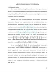 El servicio público de transporte urbano de la ciudad de Hermosillo: Análisis de los procedimientos administrativos de la concesión 1982 - 2004 1.2.2. Dimensión Política. En el contexto de la dimensión política, consideramos: a) Las repercusiones en el mercado y en la sociedad provocadas por la ineficiencia del gobierno en la implementación de las políticas públicas, y b) La fuerza política que ejercen grupos de poder en economía y la regulación del servicio de transporte. Problemas tales como crecimiento poblacional de las ciudades, la insuficiente infraestructura urbana así como la participación de las actividades económicas en el crecimiento nacional, impulsaron la creación de un plan de gobierno para desarrollar e incentivar el desarrollo económico de las ciudades del país. Dentro de ese plan de gobierno el transporte público figuraba como uno de los principales servicios que habría de analizar y atender con prontitud. Su operación y funcionamiento dejan mucho que desear, ya que a) El desarrollo del transporte no estaba asociado a las políticas de mejoramiento de la infraestructura vial, b) Los autobuses rebasaban por mucho la vida útil para prestar el servicio, c) Falta de organización y planeación del transporte y su impacto negativo en el desarrollo de la sociedad. (Federalismo y Desarrollo 59. 1997:12-13) En este contexto, podemos apreciar uno de los fundamentos de la teoría de la Elección Pública, como lo es la falla del gobierno en la intervención de la economía. La falta de asignación de recursos para obras de infraestructura vial y la falta de una planeación en materia de mantenimiento, denotan, en el caso del transporte público, una intervención ineficiente del gobierno que limita la participación de los actores en el desarrollo económico. Las fallas por comisión u omisión en las que incurra el gobierno se traducen a la postre en la pérdida de la eficiencia económica y el bienestar social. (Ayala. 1996: 290-291) 24