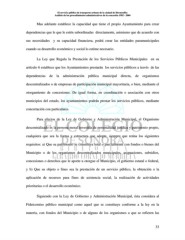 El servicio público de transporte urbano de la ciudad de Hermosillo: Análisis de los procedimientos administrativos de la concesión 1982 - 2004 Mas adelante establece la capacidad que tiene el propio Ayuntamiento para crear dependencias que le que le estén subordinadas directamente, asimismo que de acuerdo con sus necesidades y su capacidad financiera, podrá crear las entidades paramunicipales cuando su desarrollo económico y social lo estime necesario. La Ley que Regula la Prestación de los Servicios Públicos Municipales en su artículo 6 establece que los Ayuntamientos prestarán los servicios públicos a través de las dependencias de la administración pública municipal directa, de organismos descentralizados o de empresas de participación municipal mayoritaria, o bien, mediante el otorgamiento de concesiones. De igual forma, en coordinación o asociación con otros municipios del estado, los ayuntamientos podrán prestar los servicios públicos, mediante concertación con particulares. Para efectos de la Ley de Gobierno y Administración Municipal, el Organismo descentralizado es la persona moral investida de personalidad jurídica y patrimonio propio, cualquiera que sea la forma y estructura que adopte, siempre que reúna los siguientes requisitos: a) Que su patrimonio se constituya total o parcialmente con fondos o bienes del Municipio o de los organismos descentralizados municipales, asignaciones, subsidios, concesiones o derechos que le aporte u otorgue el Municipio, el gobierno estatal o federal, y b) Que su objeto o fines sea la prestación de un servicio público, la obtención o la aplicación de recursos para fines de asistencia social, la realización de actividades prioritarias o el desarrollo económico. Siguiendo con la Ley de Gobierno y Administración Municipal, ésta considera al Fideicomiso público municipal como aquel que se constituye conforme a la ley en la materia, con fondos del Municipio o de alguno de los organismos a que se refieren las 33