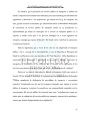 El servicio público de transporte urbano de la ciudad de Hermosillo: Análisis de los procedimientos administrativos de la concesión 1982 - 2004 En virtud de que la prestación del servicio público de transporte es atributo del Estado, el Ejecutivo de la entidad tiene la facultad para concesionarlo y para ello deberá dar seguimiento y observancia a las disposiciones que emanan de la Ley de Transporte. Por tanto, quedan sin efecto las facultades que anteriormente tenían los Presidentes Municipales de concesionar el servicio público de transporte dentro de su jurisdicción. La responsabilidad que tenían los municipios en el servicio de transporte público se va alejando, el Estado asume para sí una posición estratégica en el orden regulatorio del transporte, estrategia que supone al Ejecutivo del Estado cierto control en las operaciones en materia de transporte. Dada la importancia que a través de los años ha ido adquiriendo el transporte público y de lo complejo de su funcionamiento, se crea la Dirección de Transporte del Estado la cual funciona como una dependencia del Poder Ejecutivo. Dicha dependencia es responsable de la “planeación y supervisión de los servicios públicos y privados de transportes, la conciliación de los conflictos que se susciten en la explotación de los servicios concesionados y las atribuciones que la Ley y los Reglamentos le confieran”. Dentro de los avances interesantes en materia de transporte está lo que asienta la fracción VII del artículo 5º de la Ley al considerar que son atribuciones del Gobernador “Publicar anualmente la declaratoria de necesidades de transporte y convocatoria respectiva” formalizando con ello uno de los puntos principales para mejorar el servicio público de transporte. Asimismo, la asunción de una responsabilidad compartida con los concesionarios del servicio público de transporte para crear “sociedades que tengan por objeto tanto la explotación del servicio público de transporte, como servicios auxiliares y conexos que tiendan al mejoramiento de su explotación”. 53