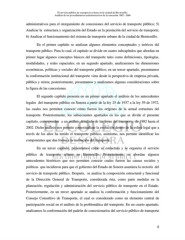 El servicio público de transporte urbano de la ciudad de Hermosillo: Análisis de los procedimientos administrativos de la concesión 1982 - 2004 administrativos para el otorgamiento de concesiones del servicio de transporte público; 5) Analizar la estructura y organización del Estado en la prestación del servicio de transporte; 6) Analizar el funcionamiento del sistema de transporte urbano de la ciudad de Hermosillo. En el primer capítulo se analizan algunos elementos conceptuales y teóricos del transporte público. Para lo cual, el capítulo se divide en cuatro subcapítulos que abordan en primer lugar algunos conceptos básicos del transporte tales como definiciones, tipologías, modalidades, y redes espaciales; en un segundo apartado, analizaremos las dimensiones económicas, políticas y sociales del transporte público; en un tercer apartado, presentamos la conformación institucional del transporte vista desde la perspectiva de empresa privada, pública y mixta; posteriormente, presentamos y analizamos algunas consideraciones sobre la figura de las concesiones. El segundo capítulo presenta en un primer apartado el análisis de los antecedentes legales del transporte público en Sonora a partir de la ley 25 de 1937 a la ley 59 de 1972, las cuales nos permiten conocer cómo fueron los orígenes de la actual estructura del transporte. Posteriormente, los subsecuentes apartados en los que se divide el presente capítulo, corresponden a un análisis detallado de las leyes del transporte de 1982 hasta el 2002. Dicho análisis nos permite contextualizar la evolución dentro de la esfera legal que a través de los años ha tenido el transporte público, asimismo, nos permite identificar los componentes que dan forma a la institución del transporte. En un tercer capítulo, presentamos cómo se estructura y se organiza el servicio público de transporte urbano en Hermosillo. Primeramente, se abordan algunos antecedentes históricos que nos permiten conocer cuales fueron las causas sociales y políticas que incidieron para que el gobierno del Estado de Sonora asumiera la rectoría del servicio de transporte público. Después, se analiza la composición estructural y funcional de la Dirección General de Transporte, considerada ésta, como parte medular en la planeación, regulación y administración del servicio público de transporte en el Estado. Posteriormente, en un tercer apartado se analiza la conformación y funcionamiento del Consejo Consultivo de Transporte, el cual es considerado como un elemento central de participación social en el análisis de la problemática del transporte. En un cuarto apartado, analizamos la conformación del padrón de concesionarios del servicio público de transporte 8