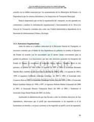 El servicio público de transporte urbano de la ciudad de Hermosillo: Análisis de los procedimientos administrativos de la concesión 1982 - 2004 acuerdo con su ámbito municipal por: los ayuntamientos de los Municipios del Estado o la Dependencia que los mismos determinen y los Inspectores de Transporte Municipal. Dada la importancia que reviste la organización del transporte, en este apartado nos centraremos a analizar la conformación organizacional y funcionamiento de la Dirección General de Transporte considera ésta como una Unidad administrativa dependiente de la Secretaría de Infraestructura Urbana y Ecología. 3.5.1. Estructura Organizacional. Antes de entrar en el análisis estructural de la Dirección General de Transporte, es necesario comentar que el titular de ésta dependencia de gobierno lo nombra el Ejecutivo del Estado de acuerdo con las necesidades que él mismo estime convenientes para su gestión de gobierno. Los funcionarios que han sido directores generales de transporte del Estado de Sonora, se encuentran el licenciado Marco Antonio Yanahara Mora en dos periodos, el primero de 1984 a1986, el segundo de 1997 al 2000; el licenciado Bernardo Sánchez Ríos, también en dos ocasiones, la primera de 1986 a 1987, y la segunda de 1992 a 1995; el ingeniero Guillermo Lizárraga Lizárraga de 1987 a 1992; el licenciado Julio Casanova Kim en 1995; la licenciada Guadalupe Favela Jasso de 1995 a 1996; el licenciado Rafael Gastélum Salazar de 1996 a 1997; el ingeniero Roberto Rubial Astiazarán del 2000 al 2001; el licenciado Horacio Valenzuela Ibarra del 2001 al 2003 y finalmente el licenciado Jorge Durán Puente del 2003 a la fecha. Analizando la administración que han llevado a cabo los distintos directores de ésta dependencia, observamos que el perfil que mayoritariamente se ha requerido es el de licenciatura en derecho y en pocas ocasiones se ha requerido un perfil a nivel de ingeniería. 84
