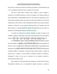 El servicio público de transporte urbano de la ciudad de Hermosillo: Análisis de los procedimientos administrativos de la concesión 1982 - 2004 Para tal efecto, debe poner en práctica las medidas que garanticen su funcionamiento y que a su vez contribuyan al desarrollo social y económico de la sociedad. Para que se pueda lograr el objetivo antes señalado, es preciso organizar y especificar las actividades inherentes al servicio de transporte y por supuesto delegar en áreas especializadas la responsabilidad de llevar a buen término tan importante servicio. Luego entonces podemos advertir que, dentro de las funciones específicas de la Dirección Administrativa, está la de llevar a cabo la administración eficiente de los recursos humanos, materiales y financieros con que cuenta la Dirección General de Transporte, para ello deberá sujetarse a la partida presupuestal asignada para dicha Dirección, de acuerdo a lo establecido en el Presupuesto de Egresos del Estado de Sonora. La función de la Dirección de Atención Ciudadana es atender las quejas de los ciudadanos y público en general que se generen por la prestación del servicio de transporte, asimismo llevar a cabo las acciones conducentes a la solución pertinente de las mismas. Con la finalidad de conocer y evaluar la problemática tanto social como económica del servicio público de transporte se creó la Dirección Técnica, cuya función principal es la de llevar a cabo la coordinación y la realización de estudios técnicos correspondientes para determinar las necesidades actuales de tan mencionado servicio. A través del Departamento de Registro Público de Transporte, la Dirección Técnica podrá ordenar y controlar de manera eficaz y oportuna el servicio público de transporte mediante la inscripción y salvaguarda de todos los actos que se relacionen con la prestación, operación y funcionamiento de dicho servicio. Parte medular de la Dirección General de Transporte es la Dirección de Control y Procedimientos Jurídicos que es la responsable de tramitar, supervisar y controlar la 88